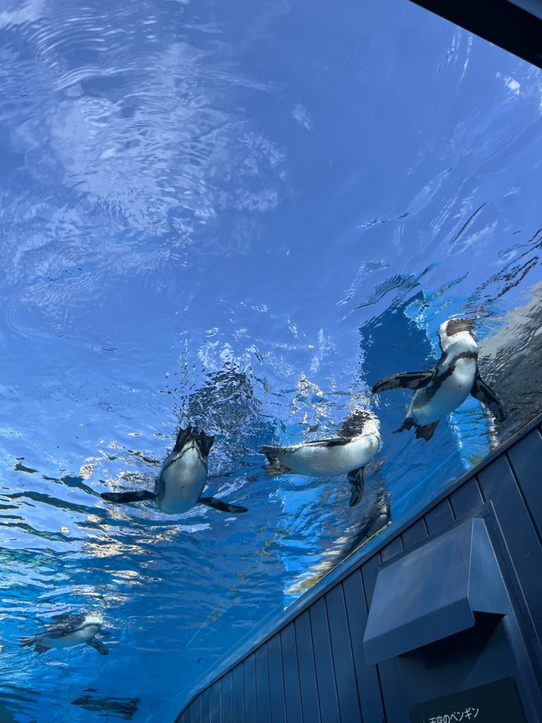 深海生物特集もやっているのに、子供たちは混んでいるところはスルー、どんどん進んでいくので20分足らずで外へ。おいおいおい、早いよ!となだめて外でアシカのトレーニング、ペンギンをたくさん見ることでなんとか一時間。
